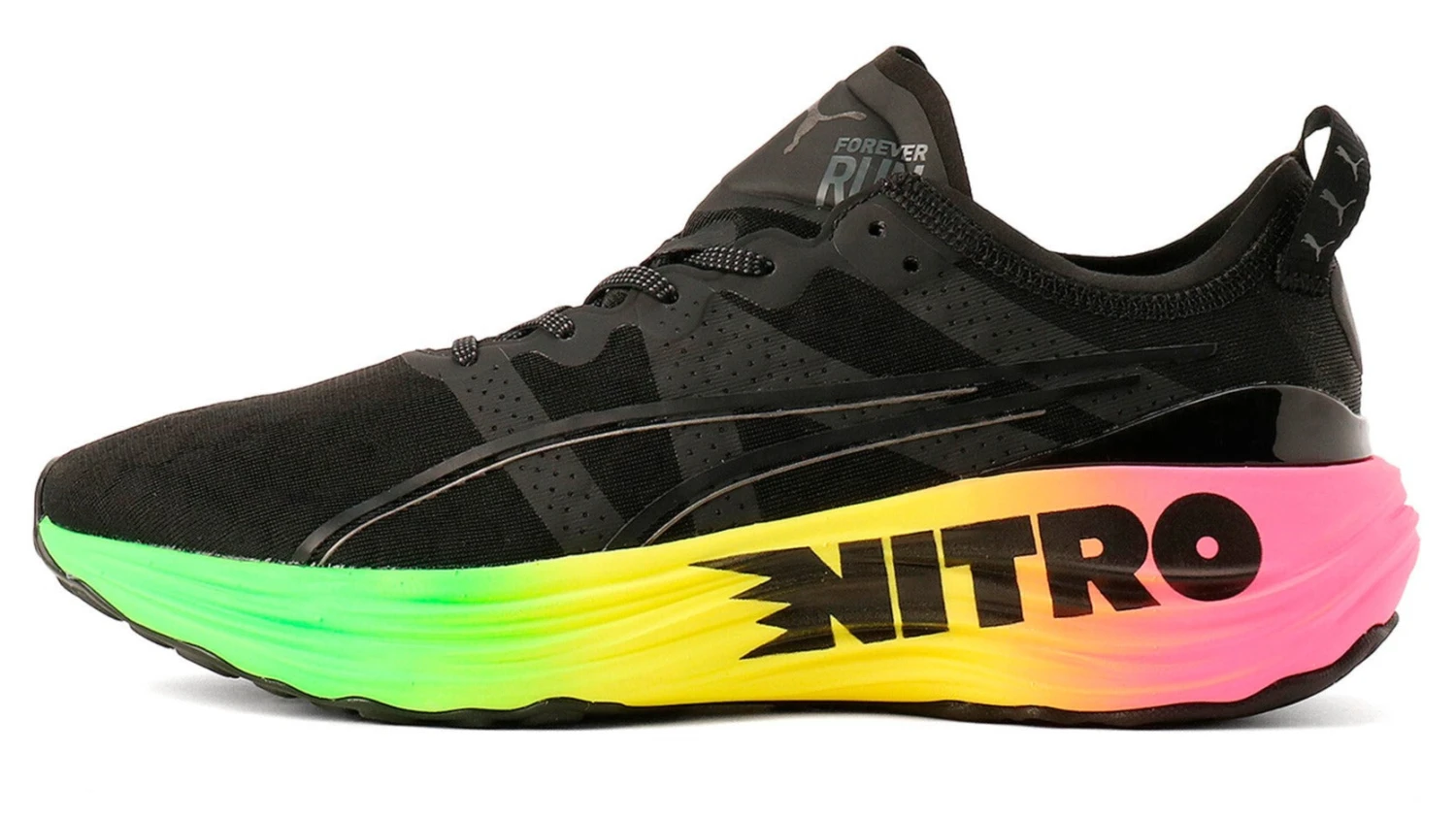 Experience support and guidance in a new way with the ForeverRun Nitro from Puma. The updated NITRO midsole has been developed with two different densities, a softer core with a firmer rim. This combination of foam with the addition of an asymmetrical heel counter assists in keeping the foot in place, offering a more supportive ride. This support continues through the outsole with a wider medial rubber segment to help stabilize late-stage pronation.